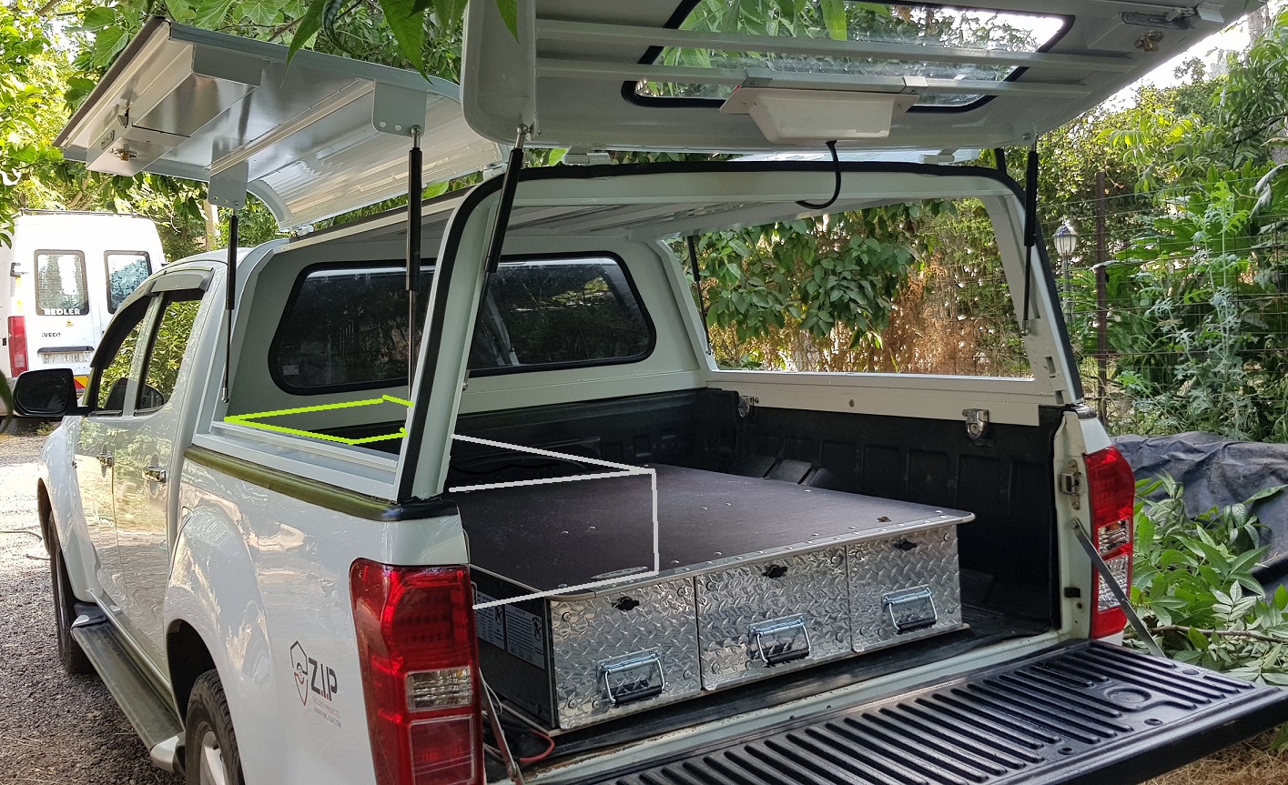 בארגז סגור נמוך של טנדר יפני נשאר מעט מאוד גובה ומקום להעמיס אם מקבעים מגירות לריצפה.