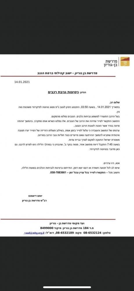 היו 4 ניסיונות גניבה באותו היום, 3 במדרשה שבה ניסו לגנוב 2 לנדקרוזר 120 ארוכים (דיזל) ואחד פראדו ארוך בנזין. הלנד קרוזרים נמצאו עם חלון אחורי שבור, דשבורדים מפורקים וסוויץ שבור ומוכנים לנסיעה והפראדו נמצא עם סימני ידים על כל הדלת נהג והמכסה מנוע ( הכלבים יצאו עליהם אז הם לא הספיקו).