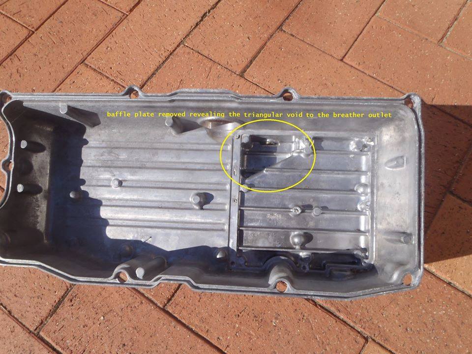 remove the rocker cover, there's a baffle plate that covers the triangular breather outlet of the rocker cover,