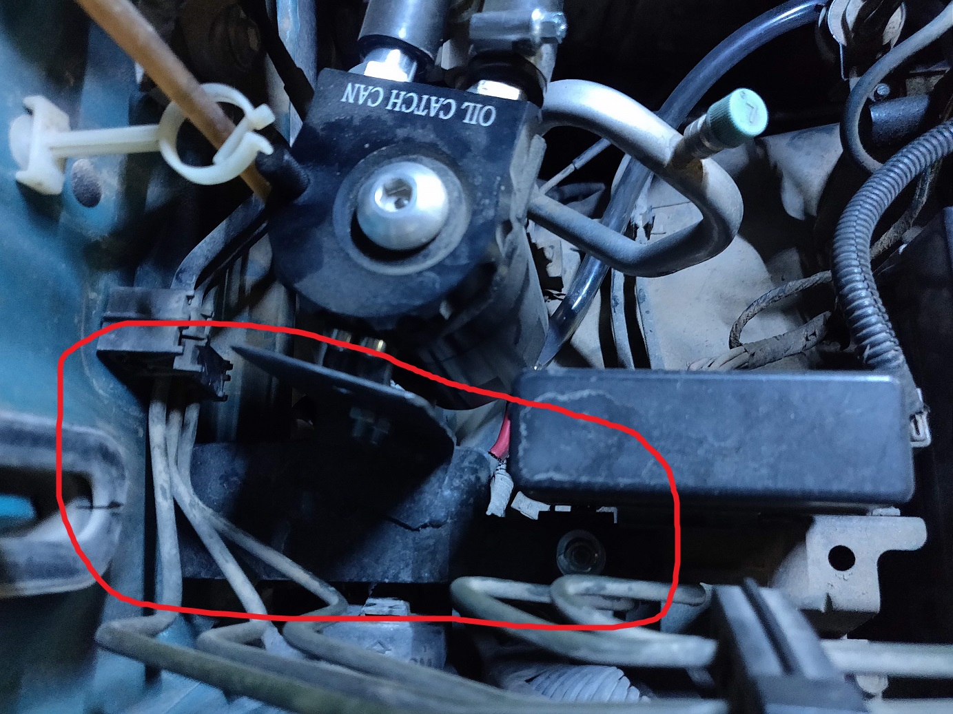 לאחר מכן, מיקמתי את הלוכד שמן שהיה לי (שהיה מורכב במיקום גבוה יחסית וגרם לטפטופי שמן) במיקום אחר בתא המנוע, מתחת לגובה צינור הנשם. אילתרתי מתאם מלוחית מתכת והרצתי צינורות לכניסה והיציאה של הלוכד (צינור באורך 1 מטר)