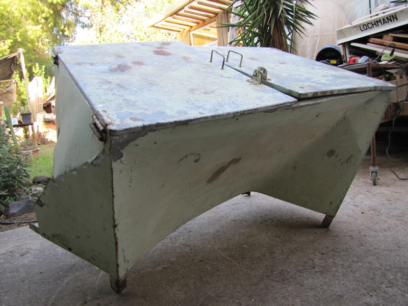 שלב ראשון- ישור משטחי הפח בעיקר באמצעות פטישים, הורדת רגליים, השלמת חתיכה חסרה בצד הארון והתחלת סגירת גם הארון.