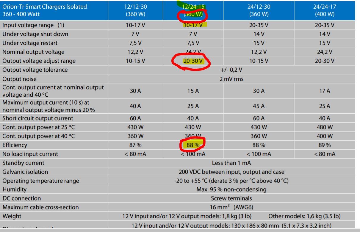 הממיר שבחרתי לא מיועד להטענת מצברים, רק משמש כבוסטר DC-DC, ההטענה בפועל מתבצעת ע"י בקר טעינה MPPT שיודע לקחת את הזרם הגבוה ולהוריד אותו למתח 24V (של המצברים בית בקארוון) ולתת זרם גבוה כפיצוי על המרת המתח.