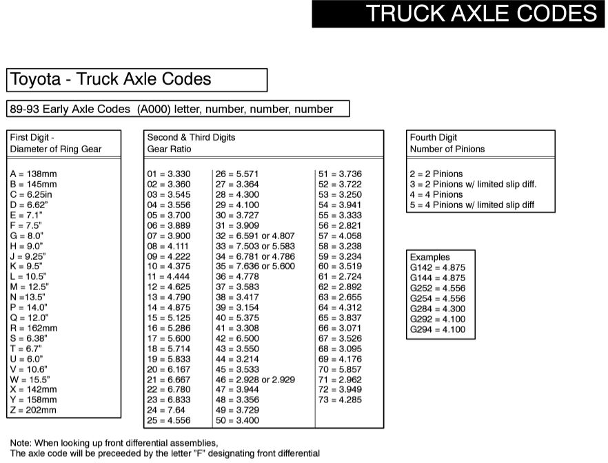 לפי החלק השני של הטבלה המצורפת (לטנדרים 94-2004), האות A אומרת שיש לך סרן קדמי 7.5" (האחורי בכל 8 אינץ'), המספר 05 אומר יחס העברה 4.7:1, והאות C אומרת שיש לך דיפרנציאל אחורי 2 פיניון מוגבל החלקה.