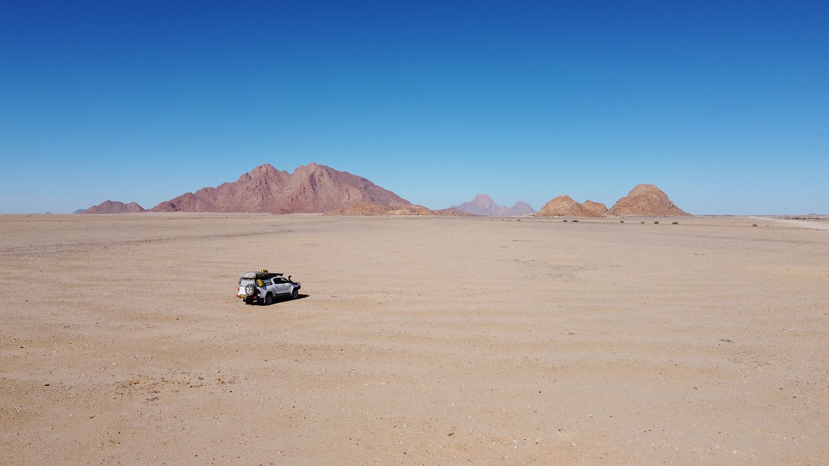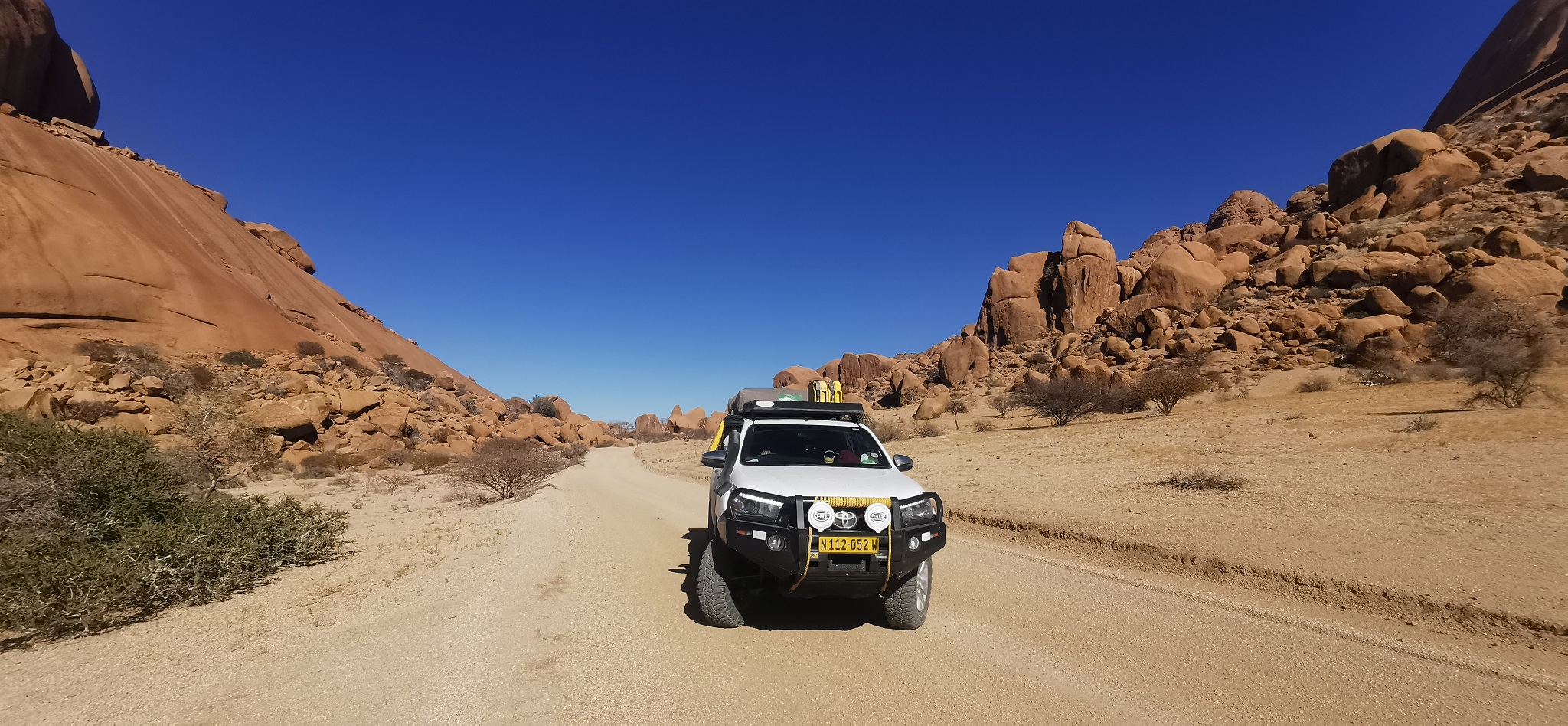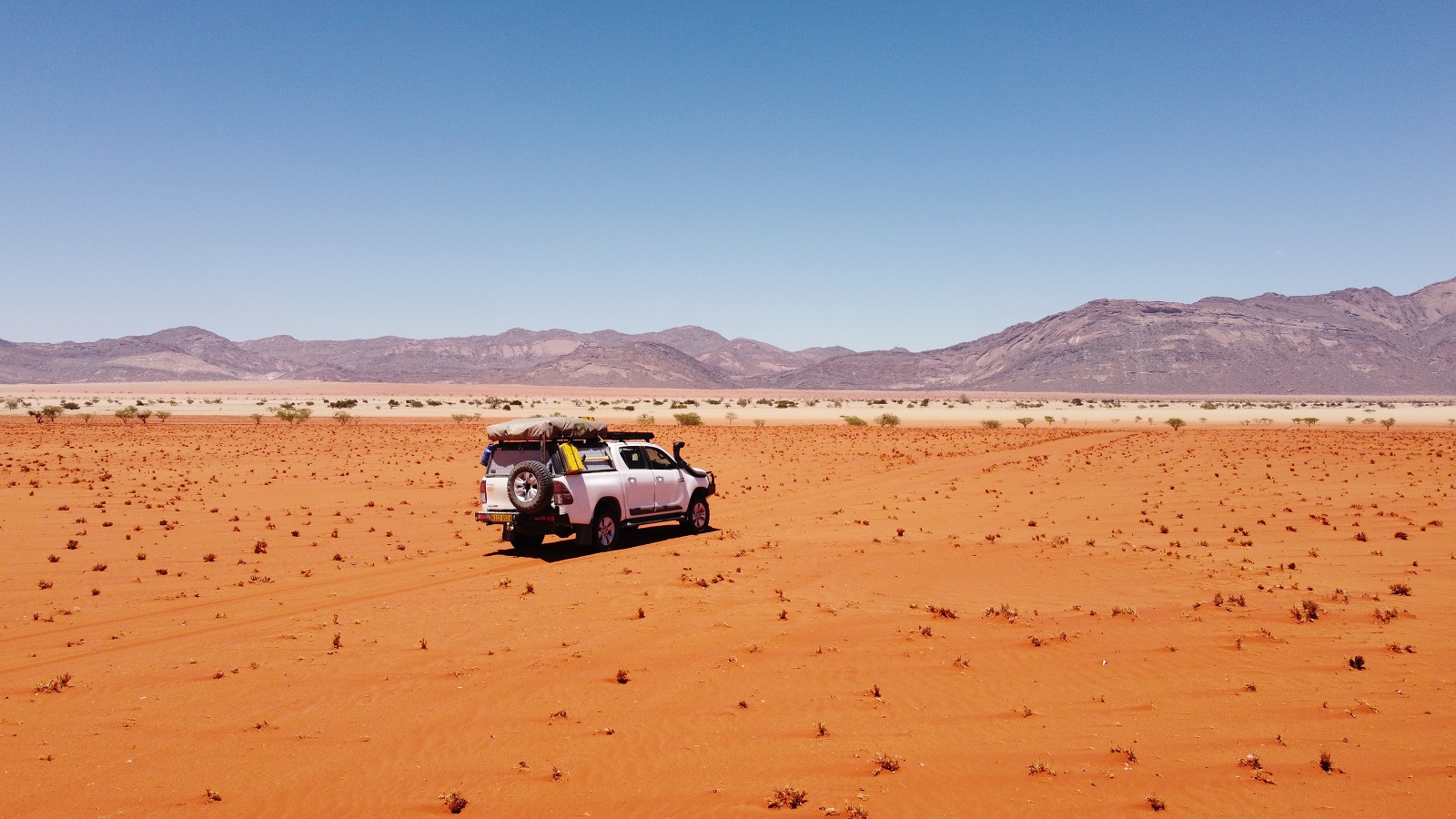 התחלנו את המסע בבירה Windhoek, הרכב הראשון ששכרנו היה טויוטה היילוקס שנת 2020 עם 12 אלף ק"מ על השעון. מצויד בהגבהה 2 אינץ' של IRON MAN, פגוש קדמי ואחורי ARB, פנסי "ראלי" של HELLA, צמיגי שטח מלא סיניים), מיכל דלק משני בנפח 65 ליטר, לסה"כ 145 ליטר בתדלות מלא, ועוד 3 ג'רקנים של 20 ליטר. כשכל העסק הזה מלא בסולר (מעל 200 ליטר), הרכב עשה כ- 2000 ק"מ מרשימים ביותר. אוהל גג, מיכל מים 60 ליטר, מקרר 45 ליטר, מערכת מגירות מלאה לאחסון, וכל הציוד הנדרש לקיום יומי בשטח (כיסאות, שולחנות, מטבח שלם ועוד), וציוד חילוץ, כולל שני גלגלי ספייר והיי-ליפט. מרשים.