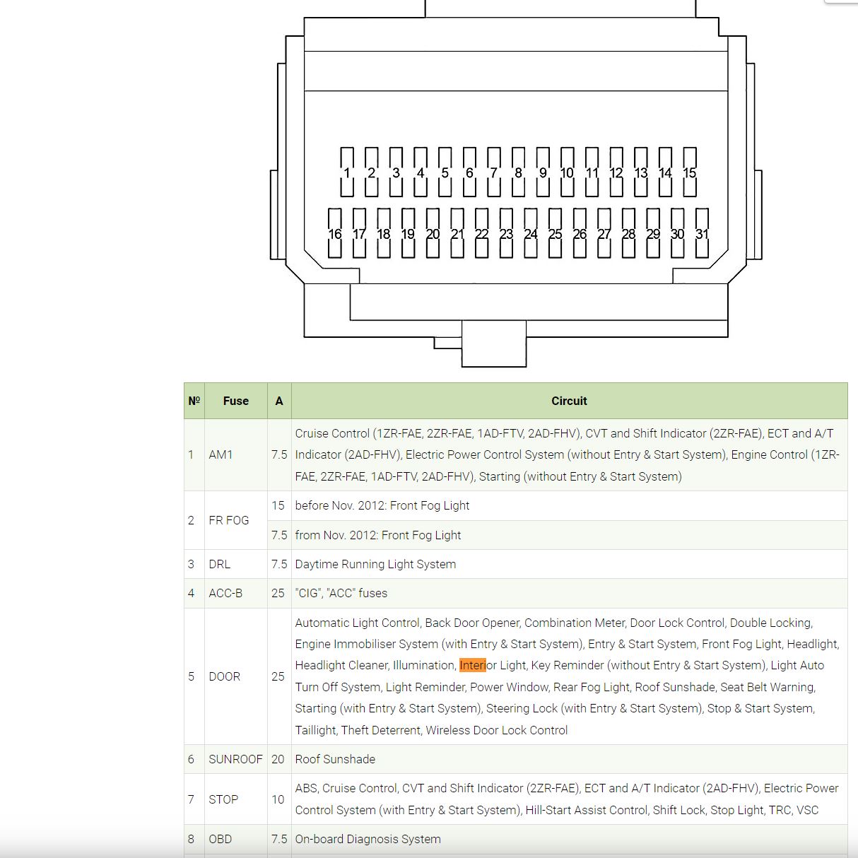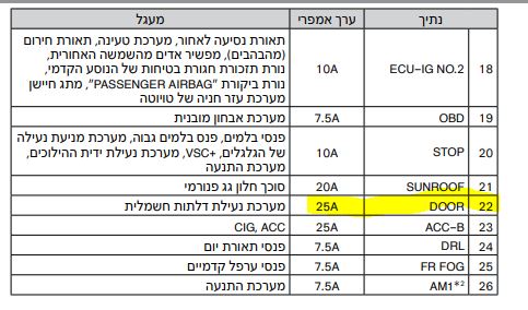חיפוש קצר בגוגל, הביא אותי אל https://fusecheck.com/toyota/toyota-...7-fuse-diagram (מקווה שזה מתאים לשנתון שלך)