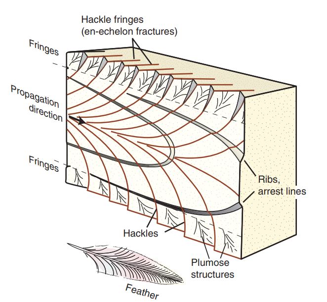 לי זה נראה כמו תוצאה של התפתחות הסדק על גבי מישור השבירה, מה שמכונה מבנה האקל (Hackle structure)