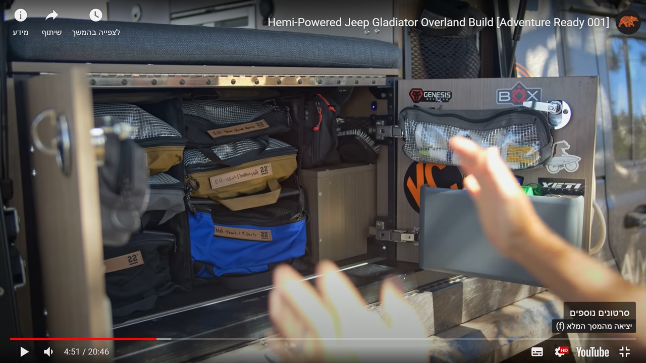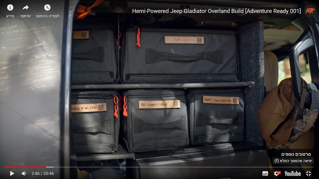 תפסו את עיני במיוחד השימוש בארגוניות\מארזי בד רכים (אך בנויים לתלפיות) לאחסון הציוד בכל מקום שיש נפח אחסון מרובע וגדול. לדוגמא בדקה: 2:42