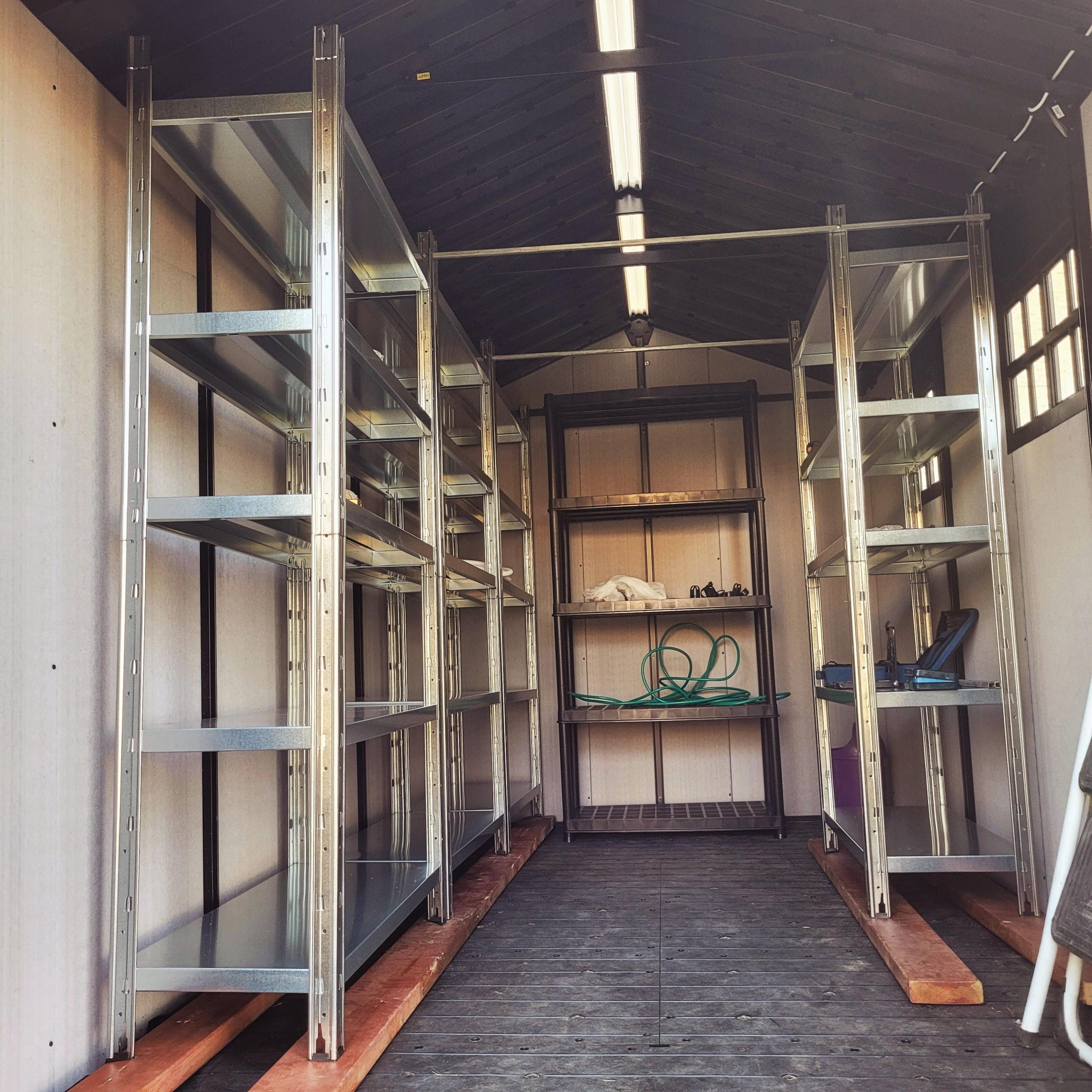 קובץ מצורף 140172שלב ביניים לפני חיבור חשמל ותאורה . הורכבו 4 סטים ארוניות המדפים , מאחר והקירות עשויים מפלסטיק/" נייר " היה לי ברור מלכתחילה שאני לא נעזר בהם לעיגון . מעבר לקורות העץ לחלוקת/פיזור לחץ/משקל מתחת לארוניות , הותקנו בחלק העליון בין 2 קירות המחסן 2 מוטות מייצבים , ריבוע ברזל מגולוון 20mm שתפקידם לשמור את הסטים עומדים .