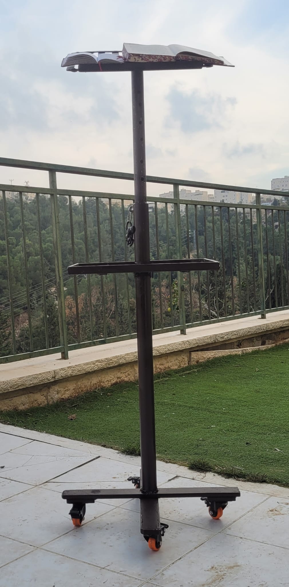 מצ"ב סקיצה ששורטטה ואז ניגשתי ללקט חומרי גלם . בסיס הסטנ' הוא ברזל שחור 50x12mm שהיה מספיק מאסיבי בחוזקו/משקלו להחזיק את הסטנ' יציב . עמוד הגובה של הסטנ' הם 2 צינורות מגולוונים , 1 בתוך ה-2 כאשר ישנן כ-8 נקודות גובה שניתן לקבע אותו החל ממצב תפילה בישיבה עד לתפילה בעמידה גם לגבוהים ממני . מדף עליון הוא לסדור/מחזור ומדף תחתון לאחסנת נרתיקי טלית/תפילין ועוד . הסטנ' יושב/נע על 4 גלגלים עם נעילה .