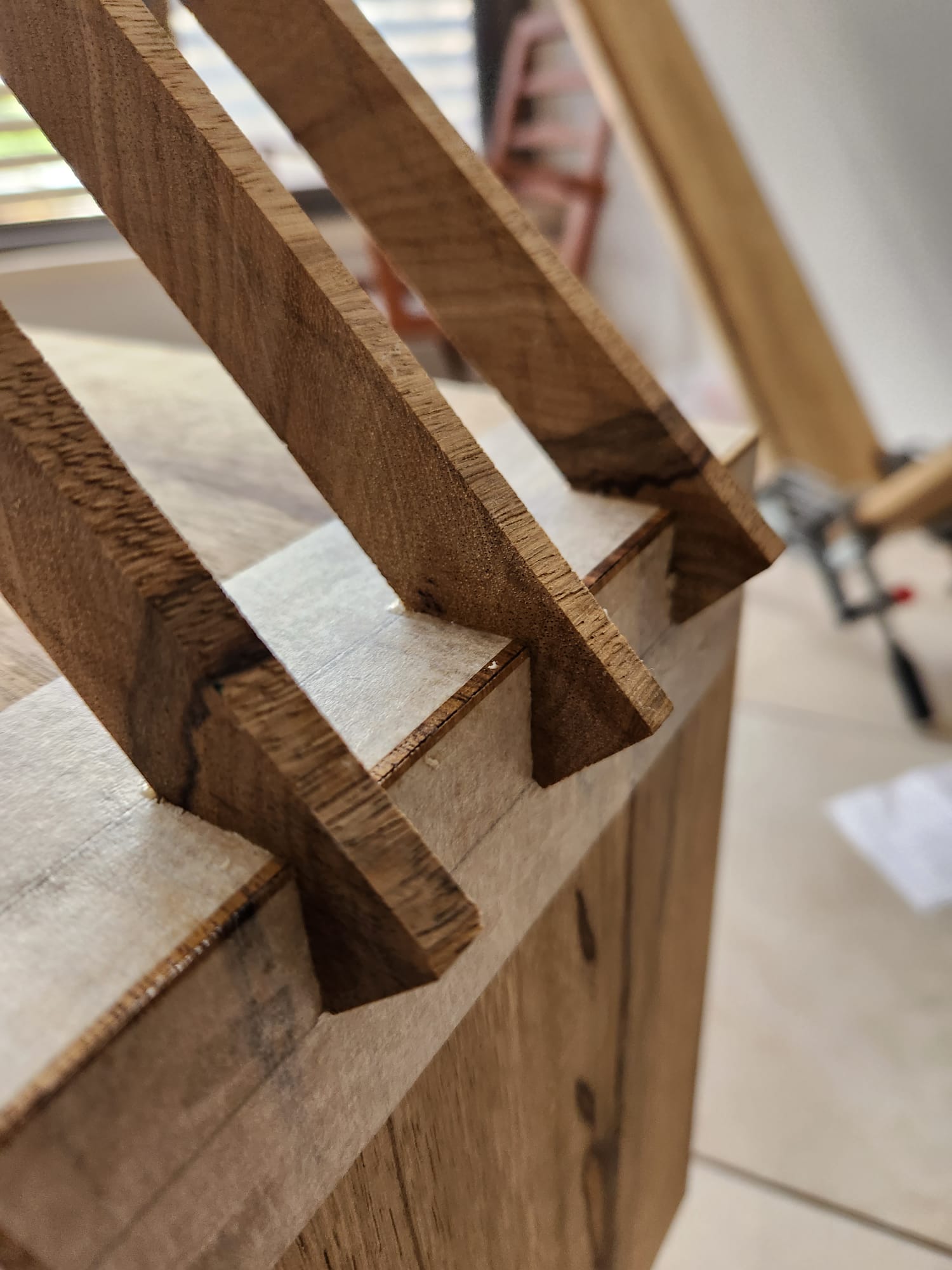 את המדפים חתכתי ב 45 מעלות, חיברתי בהדבקה, ועשיתי סוג של שיניים בחיבור - הכל בהדבקה.