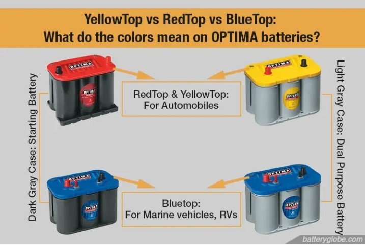 במצברי אופטימה מה שקובע אם זה פריקה עמוקה או לא, זה דווקא צבע הקייס (אפור בהיר פריקה עמוקה, אפור כהה/שחור מצבר התנעה). בפרובינציה שלנו (ישראל) נהוג להתייחס לצבע המכסה העליון, אבל זה למעשה לא מדויק. האדום תמיד יהיה מצבר התנעה, הכחול יכול להיות מצבר התנעה או מצבר פריקה עמוקה, בהתאם לצבע הקייס. הצהוב למיטב ידיעתי קיים רק בגרסת הפריקה העמוקה.