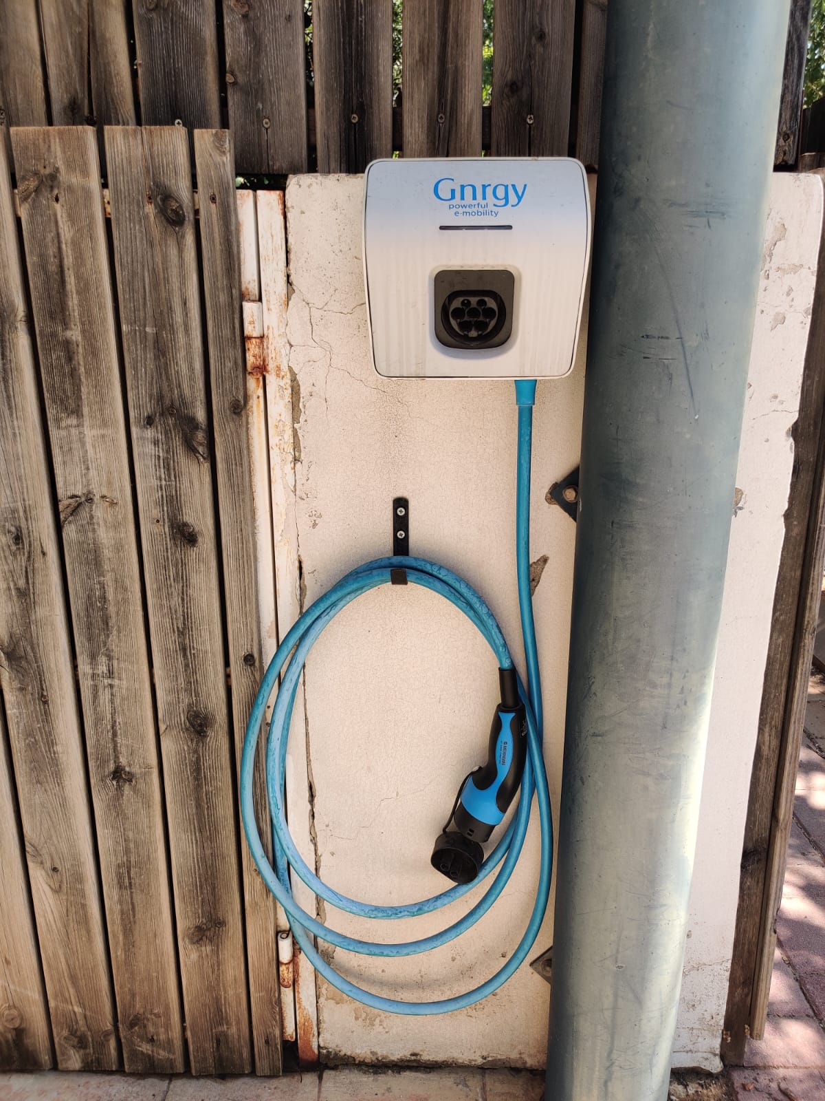 העמדה מותקנת על חומת המגרש בצד הפנימי, אך כבל הטעינה יוצא מהגדר ומאפשר טעינת הרכב החונה בחוץ, מאוד נוח כי כיום אין לי שער חשמלי, חניה בפנים הייתה מחייבת שידרוג השער, ולמצוא פתרון לאי בריחת הכלבים…