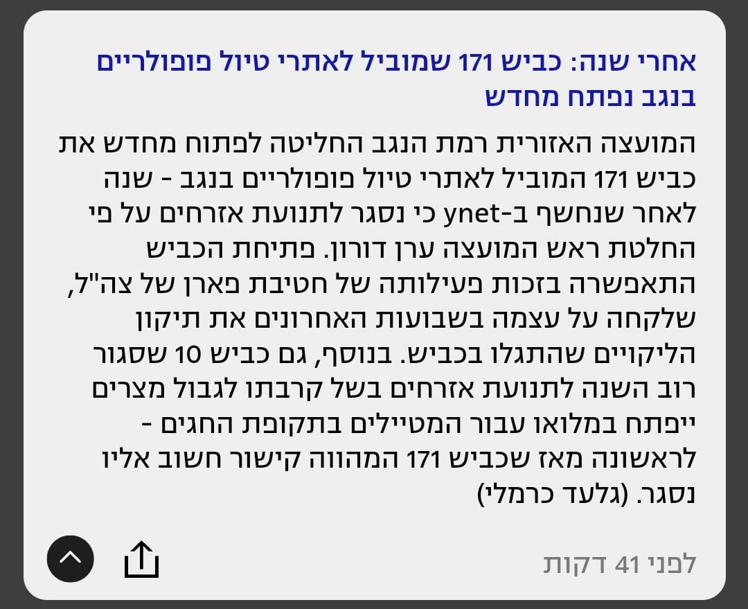 בנוסף, שימו לב שכביש 171 נפתח מחדש לתנועה עם מהירות מוגבלת ל- 50קמ"ש.