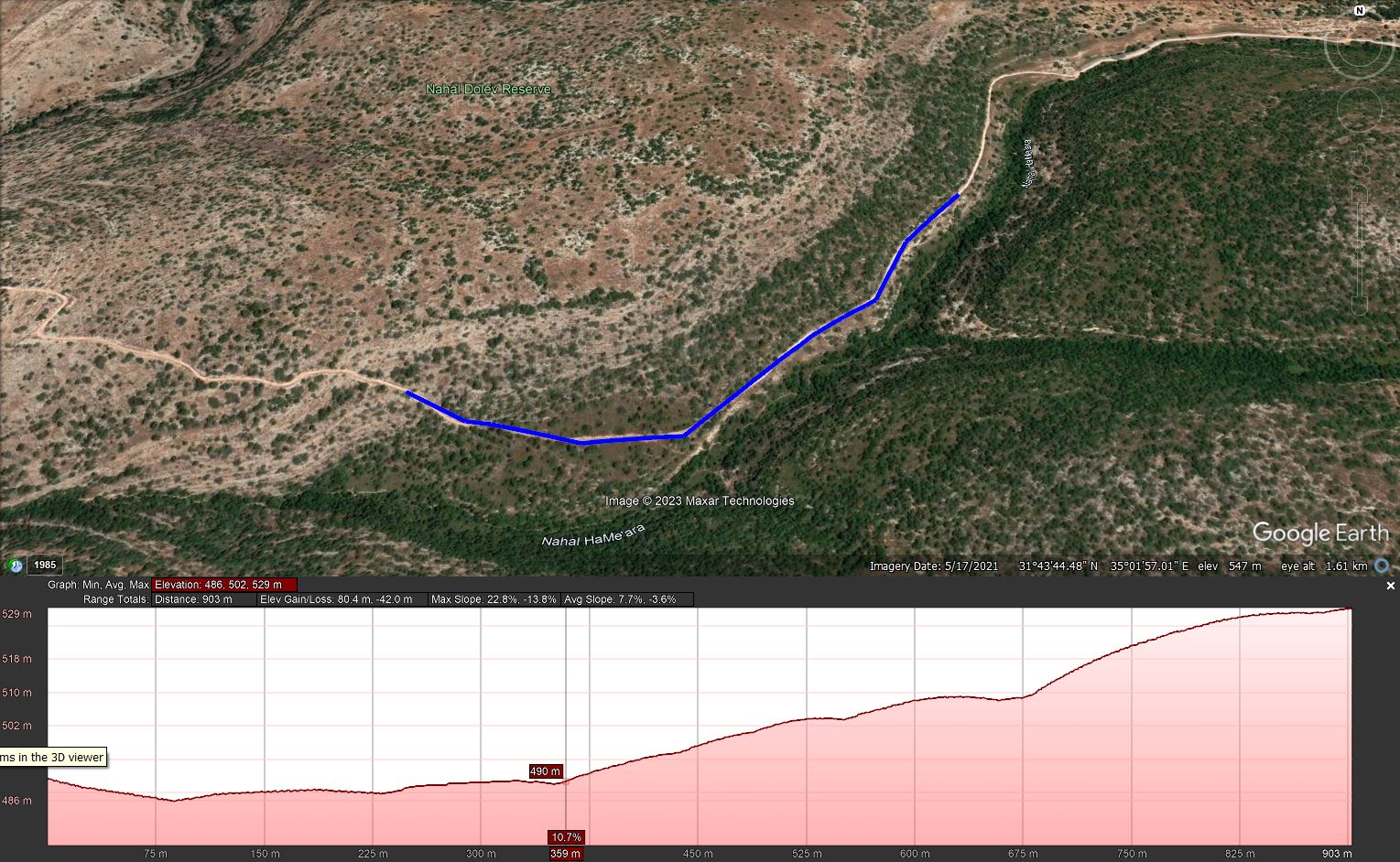 אבל ב google earth אין סימוני שבילים וגם לא קווי גובה אז אי אפשר באמת להבין איפה עובר השביל