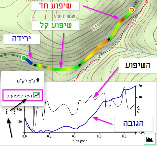 אם אתה מתעניין בשיפועים, אולי תאהב את היכולת להציג את גרף השיפועים יחד עם גרף הגובה ולהציג את השיפועים בצבעים משתנים לאורך המסלול.