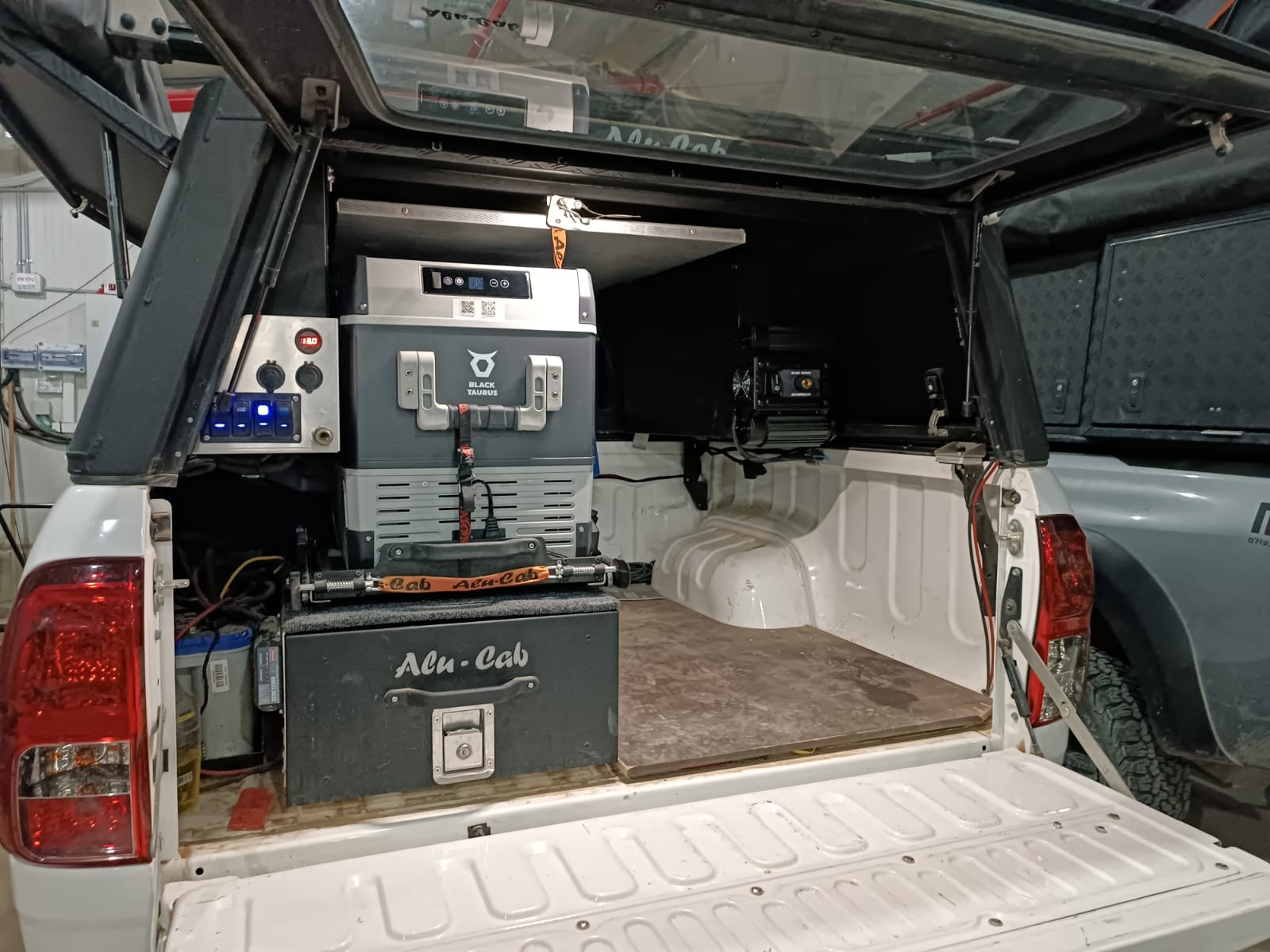 בטנדר שלי, כדי לנצל את המקום בצורה מיטבית, התקנתי מגירה שמגיעה כמעט עד קצה הארגז (בחלל שנותר מאחוריה, מיכל מים) ועליה מקרר על מגש נשלף.
