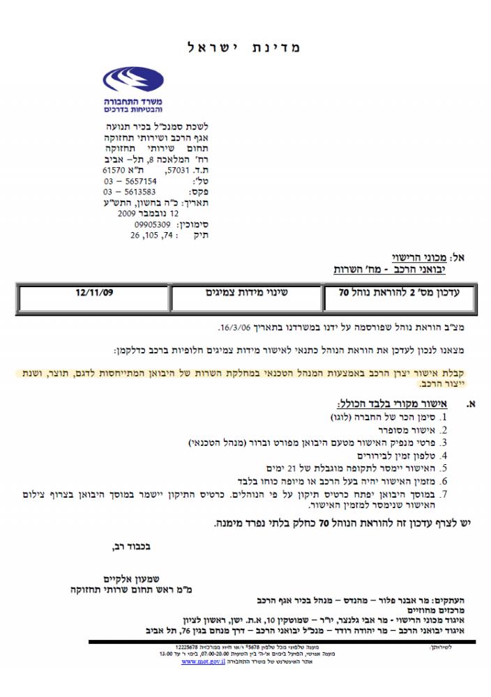 לא הייתי מבטל בכזו קלות את התשובה של MashberNafshi שלפי תשובותיו בפורום עוסק בדיוק בנושאים אלו (רישוי רכב, מכוני רישוי, תקנות רישוי וכד').