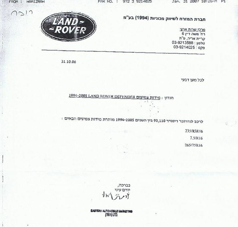 כשהחלפתי מידת צמיגים בדיפנדר (למידה 265/75R16) התבקשתי להנפיק אישור יבואן. השגתי מהמוסך צילום של האישור: