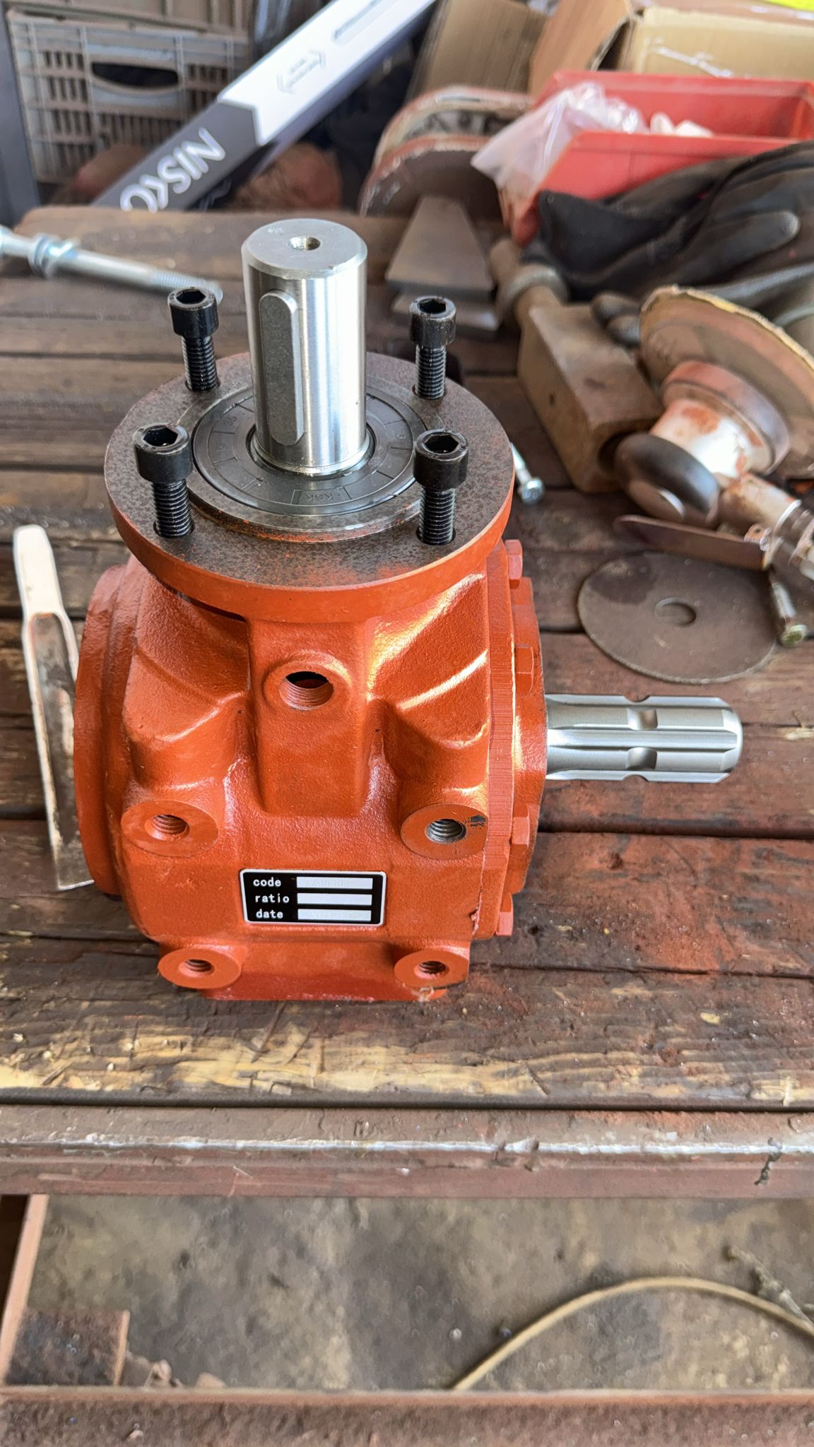 ממה שאני מבין הוא רוצה לחבר את הנ״ל ל pto של הטרקטור- הוא צריך להרים סל״ד לסכינים במכפלת יחס הקורונה פיניון- אז הפיניון , שמוחזק ע״י מסב יהיה כלפי מטה .אחרי נעילת זיקה , ה pto יסובב את אחת היציאות המקוריות לציריות .
