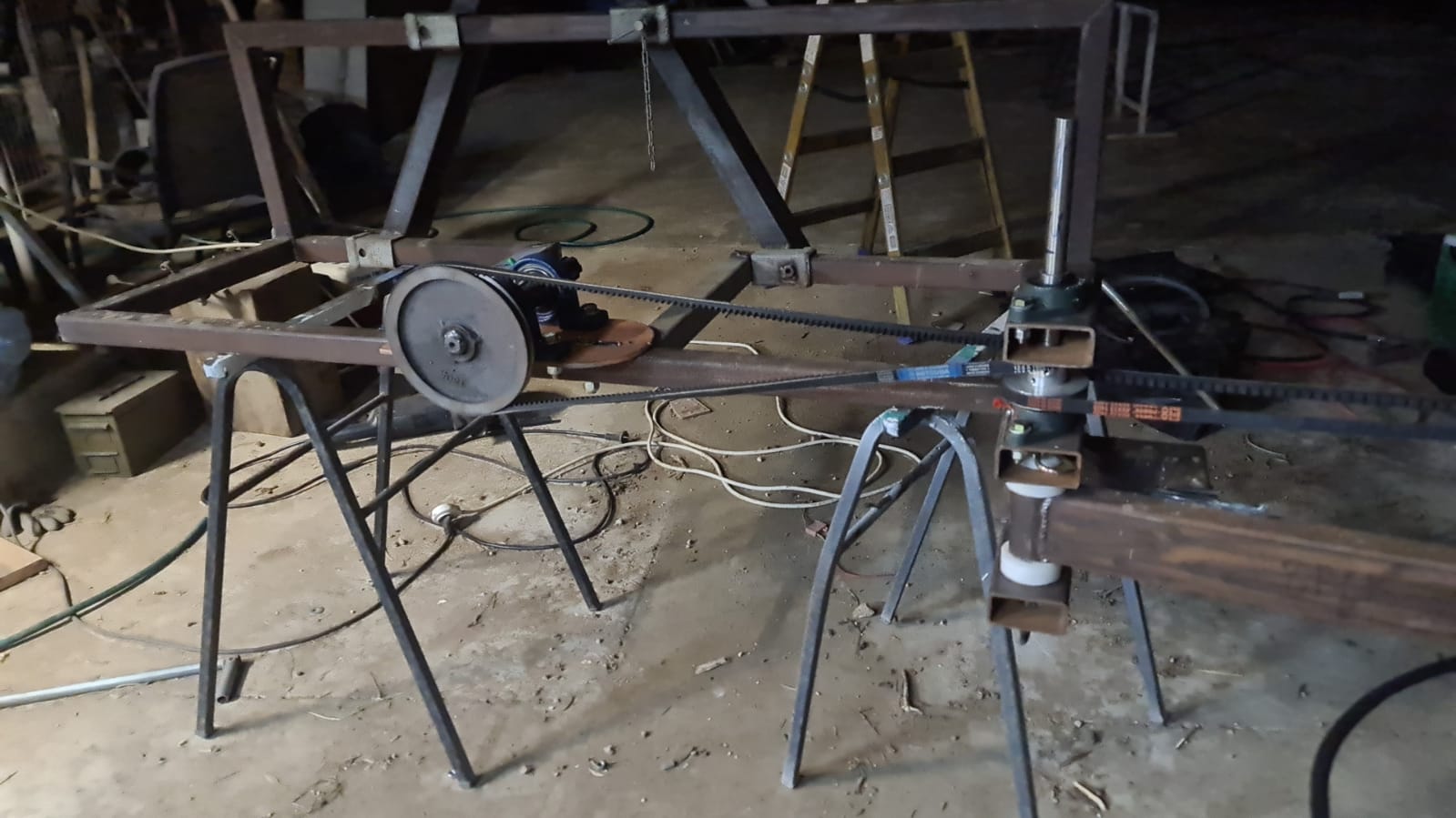 על ה-PTO של הטרקטור או בשמו האשכנזי פרטיקוף (Power Take Off) חיברתי פולי גדול שממנו יוצאת רצועה ב-90 מעלות לפולי נוסף עם רצועה על גבי זרוע מתקפלת שבתחתית הזרוע יש התקן חוטים של חרמש מוטורי. למה חוטים? כי זה מספיק יעיל ולא מזיק במקרה של פגיעה בעץ.