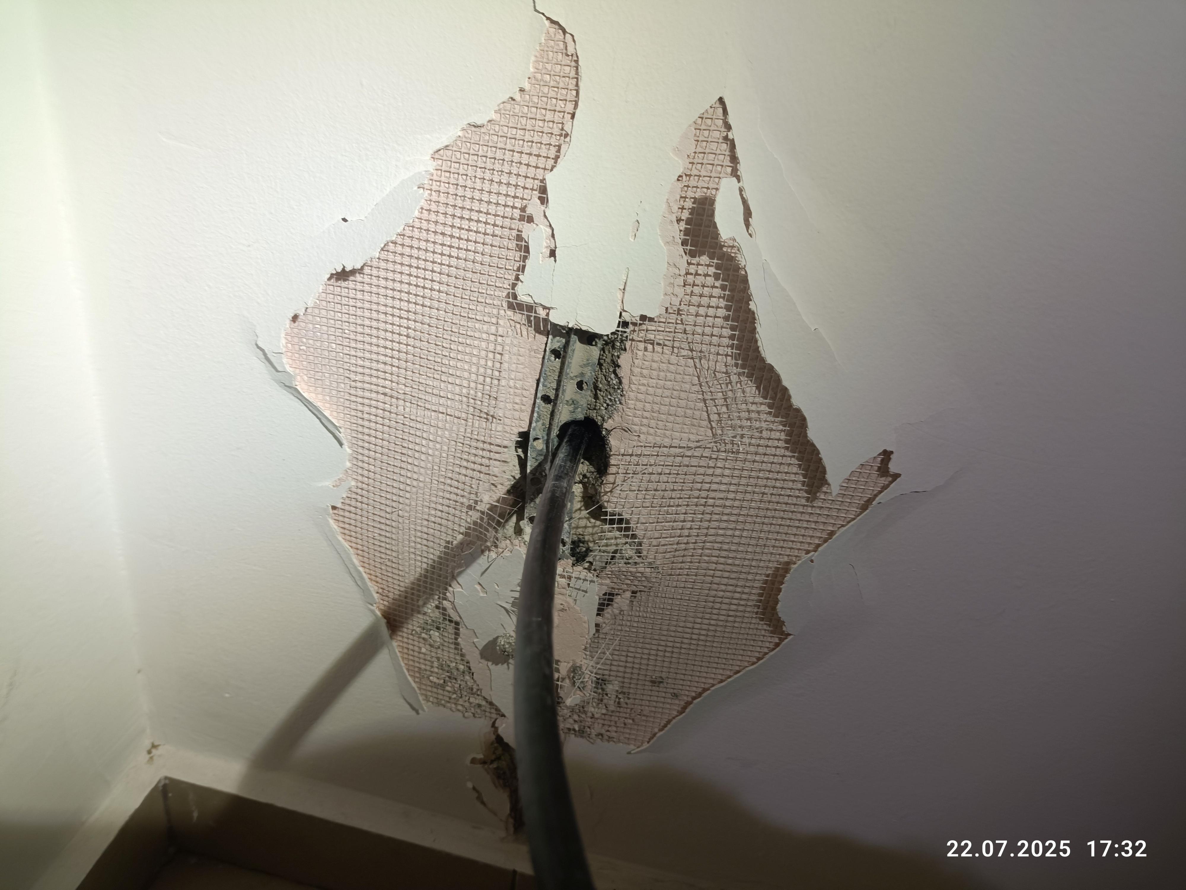 כמובן שהקדיחה שלי נפלה בדיוק על הפחית, והפחית התעקמה ומשכה איתה החוצה את הטיח.