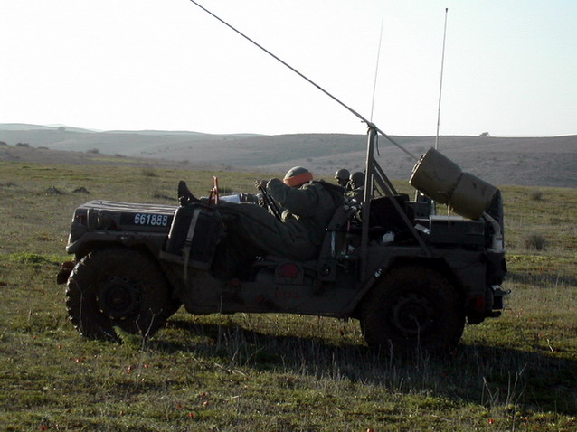 זה הדגם המתקדם של ג'יפ סיור, עם הקשת המשופרת. שימו לב למשולשים, מעין שיניים, שנועדו לחתוך תיילים. לפני ההמצאה הזאת היו פשוט מרתכים בזנ"ט גבוה בחזית הרכב שיחתוך תיילים שאולי יהיו פרוסים לאורך הדרך לפני שהם חותכים למישהו את הראש (או שלפחות זה ההסבר שאני שמעתי...). זה שאין קשת קדמית דווקא ברור, בעיקרון אמור להיות מקלע על כנה לפני המפקד שצריך לצודד לכל הכיוונים.