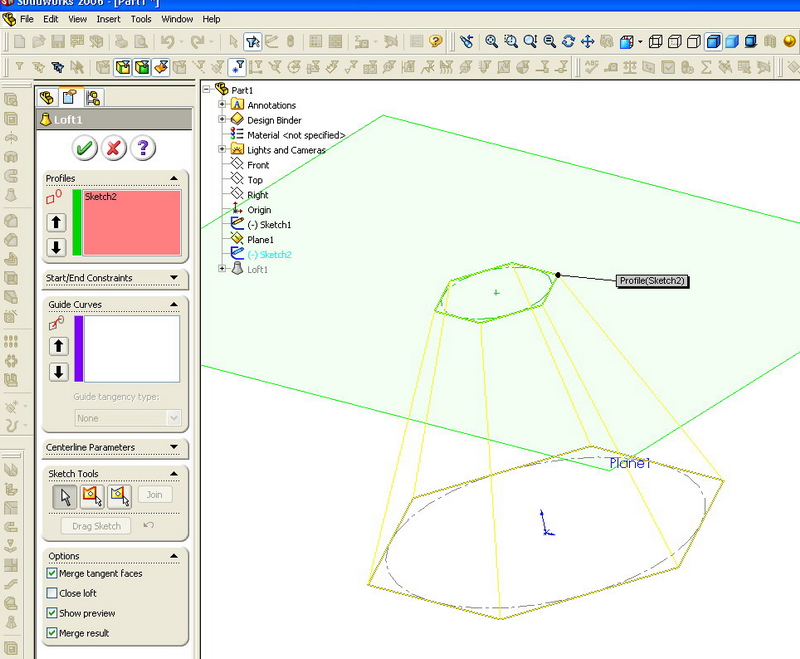 - צור loft - הכלי דורש שתי סקיצות. שים לב שכדי לייצר פירמידה שתי הצורות צריכות להיות בעל אותו מספר צלעות, ושהצלעות יהיו מקבילות אחת לשנייה.