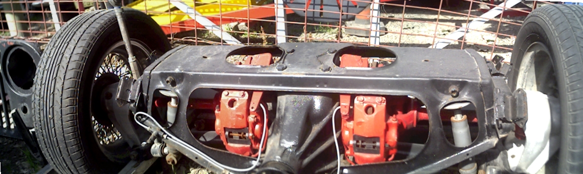 בלמי דיסק ביציאה מהדיפרנציאל. גלגלי שפיצים. כל העסק נראה שונה ומתקדם יחסית לזמנו - כי הוא ישן. אני עדיין מנחש שזה יגואר, או משהו בריטי מקביל אחר משנות ה-60.