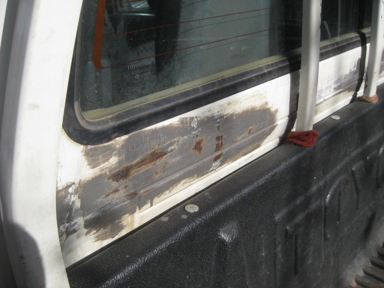 1. יש כמה כתמי חלודה בדופן האחורית של הקבינה (תמונות מצורפות) - תוצאה של ברזנט שנשאר מגולגל ותפס מים. איך מומלץ לטפל בחלודה? עם איזה צבע כדאי לצבוע?