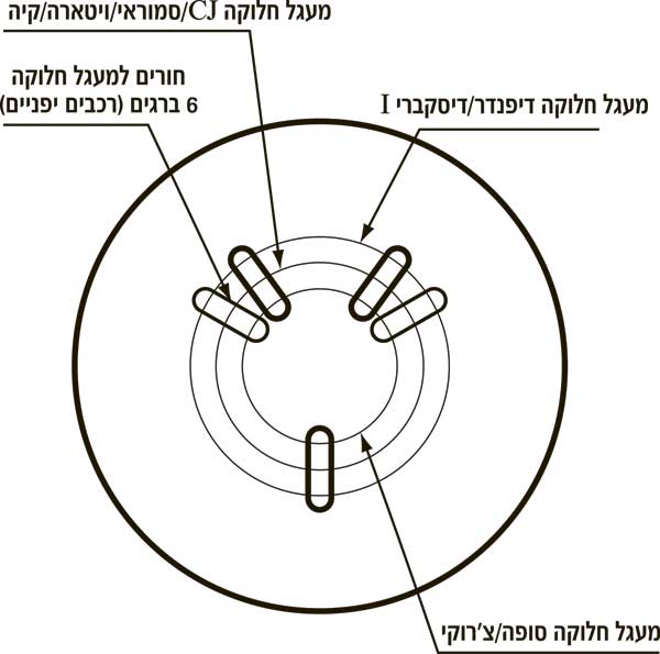 לגבי מעגל חלוקה: לא בעיה בכלל, לעשות חורים לא עגולים אלא בצורת חריצים ארוכים שרוחבם כרוחב הגוז'ון. ואז זה יוכל להתלבש על כל מתקן לגלגל רזרבי בעל חמישה חורים, ולא משנה באיזה מידת מעגל חלוקה.קובץ מצורף 53622 צירפתי לך שרטוט סכמטי: