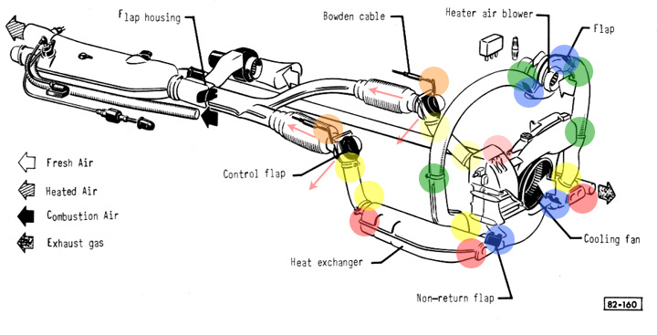 החימום המקורי בפולקסווגנים מבוסס על מחליפי חום סביב סעפות הפליטה וצנרת הפליטה. זה בדרך כלל לא עובד כי המערכת די מורכבת, ויותר גרוע מזה, כשזה כן עובד, חור קטן באגזוז מכניס גזים לתא הנוסעים, וגם אם אין חור באגזוז, אדי שמן שמטפטף עליו מורגשים היטב.