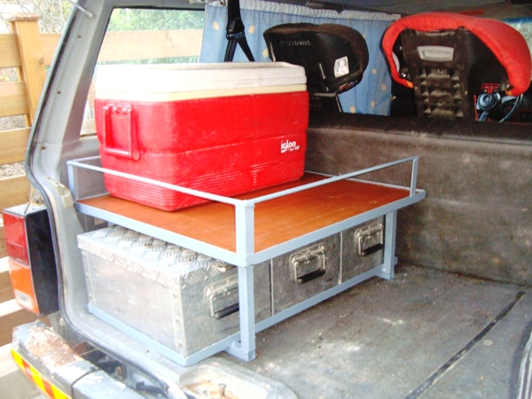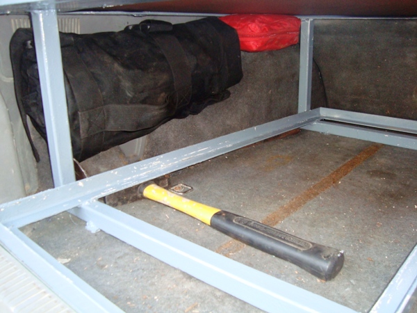 מסתבר ששלושת הארגזים נכנסים לאורך, כך שכל מה שנותר ליצר הוא מסילה מזוויתנים 25X25, ומעליה מדף (700X750 מ"מ). הכל מרותך ומחובר עם ברגיי פח לרצפה ולמתקן המקורי של גלגל הספייר שיושב במקור על הדופן - חיבור חזק מאד.