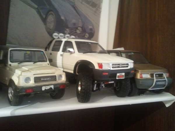 אין הרבה רכבי שטח בתחום הזה. את התמונות של אלה שיש לי העליתי קודם: הוויליס של ITALERI (מדויק ומדהים, אבל הפלסטיק מאוד חלש, הוא מתפורר בידיים), סמוראי של FUJIMI (מודל פשוט אבל מצוין), פאג'רו Q גם כן של FUJIMI (יופי של מודל), מרצדס G230 של ITALERI (ככה ככה), ויטארה דור ראשון של FUJIMI (חרא של מודל) היילקס IFS משופר מאוד של AUSHIMA (נהדר, מאוד מרשים). על הג'יפים הצבועים אני עובר בשביל הפיניש עם מים מעורבים בפודרה מדברית אורגינל. זה נותן להם מראה מאובק אותנטי.