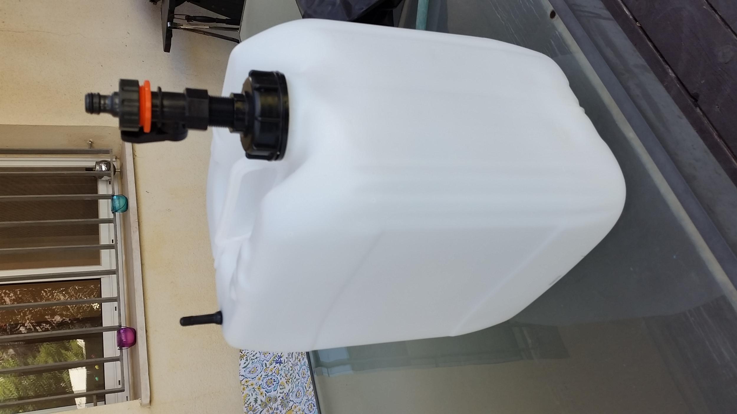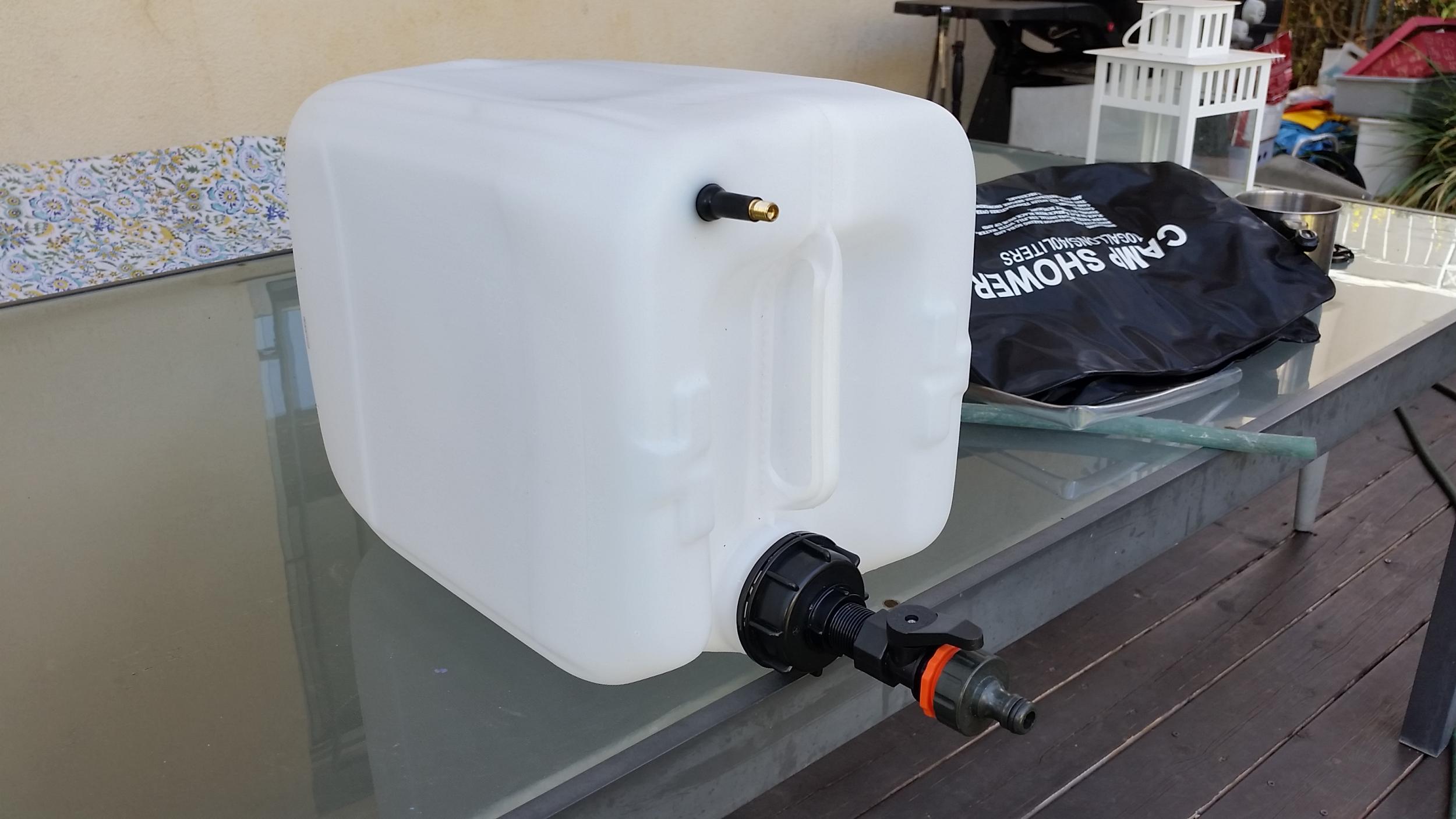 גם קניתי בפקע המשביר לחקלאי ברחוב משה יתום ברחובות. קניתי 2 מיכלים עם 3 פקקים. לפקק אחד הוספתי ברז כך שבנסיעה המיכלים סגורים עם פקק רגיל (תופס פחות נפח) ובזמן עצירה ושימוש, מחליף פקק לפקק ברז ומשכיב את המיכל. הוספתי גם ונטיל ריק למניעת וואקום