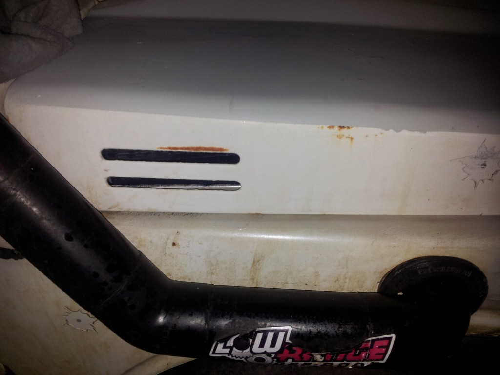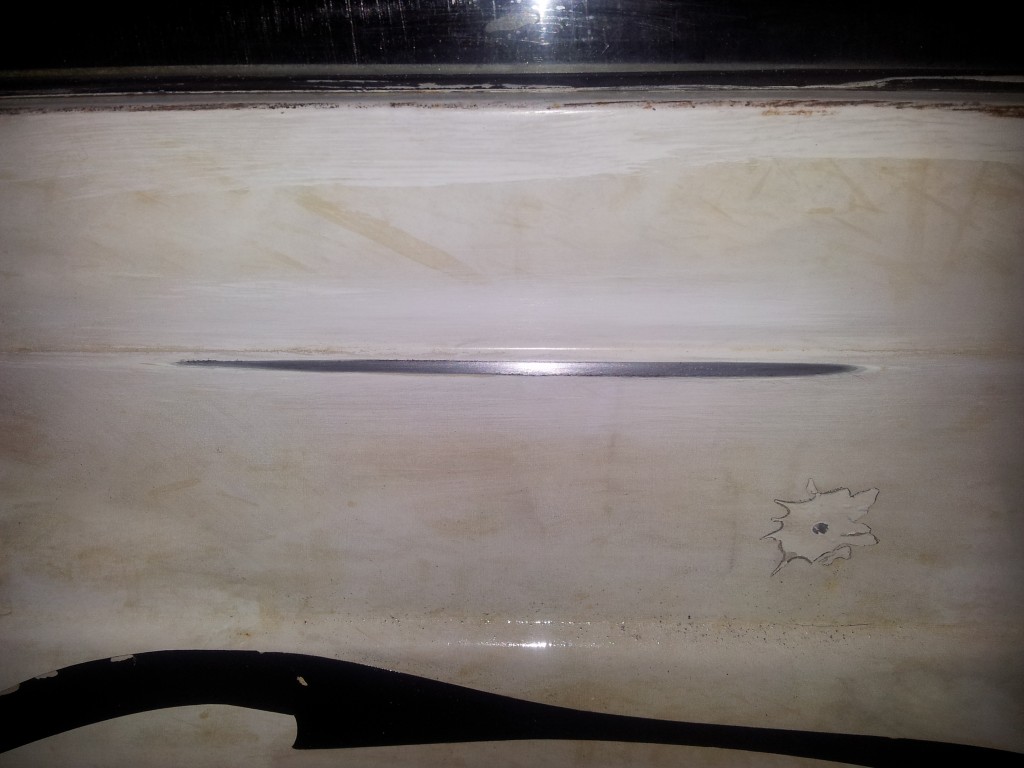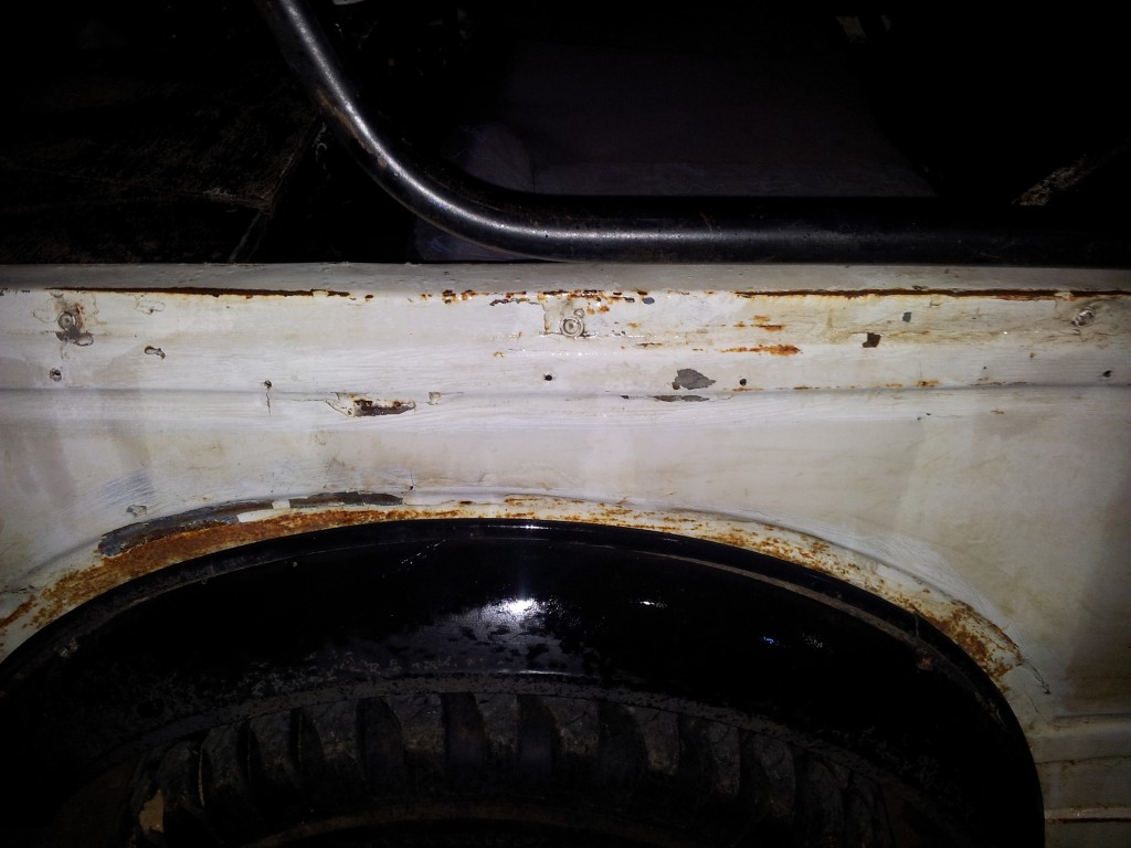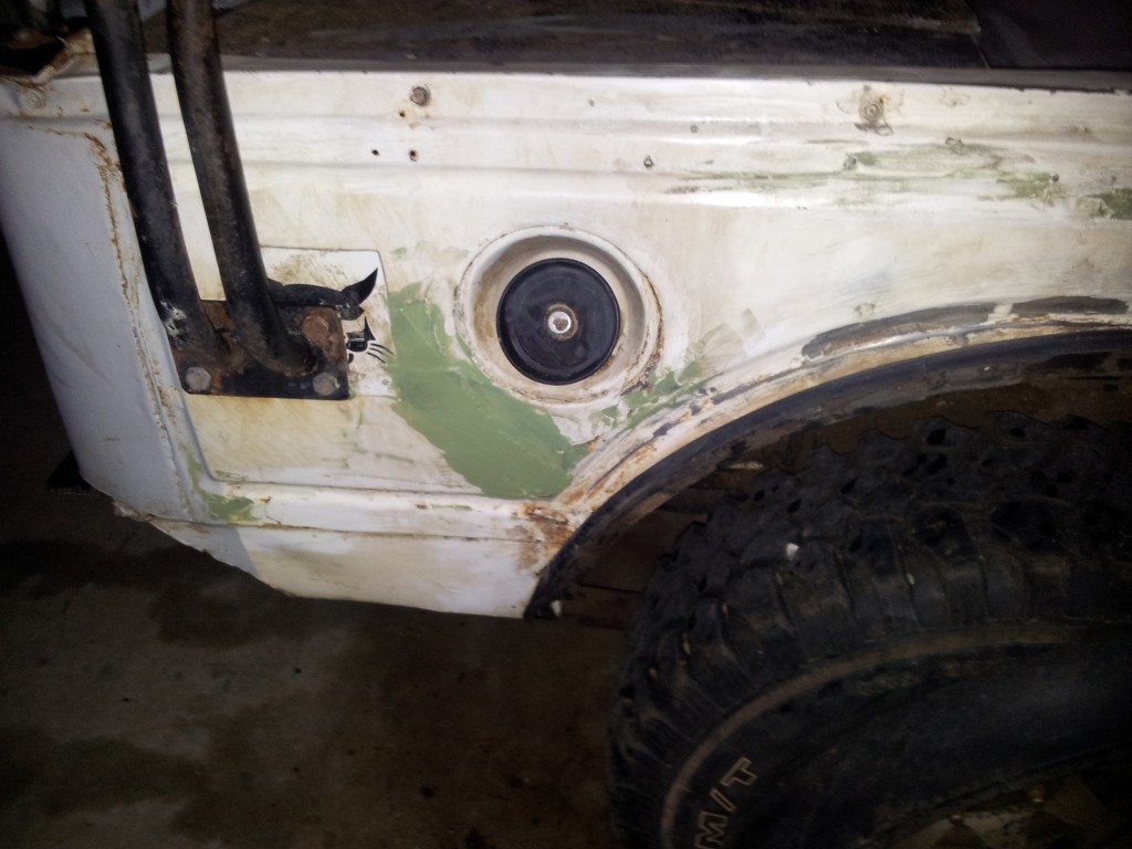 אפשרי,בתנאי שרגל אחת נשארת בחוץ. יש אנשים שבאמת לא יכולים להיכנס לסמוראי. התגלה חצ'קון במכסה מנוע. שי השקה אותו בזז-קל ונסעתי לסיבוב קצר. בכל זאת עוד מעט 11 בלילה ועשינו רק 2 הפסקות. מתחת לחצ'קון התגלה חור בפח מוקף בחלודה דקורטיבית. מרוב שהתכסחנו עליו שחכנו לצלם אותו לפני,אבל אחרי שיוף של חצי שעה עם נייר זכוכית גס מאוד שהפך מהר מאוד לנייר טואלט וכמות נדיבה מאוד של זז-קל שי התחיל לעבור עליו עם החומר פחחים. התוצאה הסופית של הבור הזה נראית ככה: