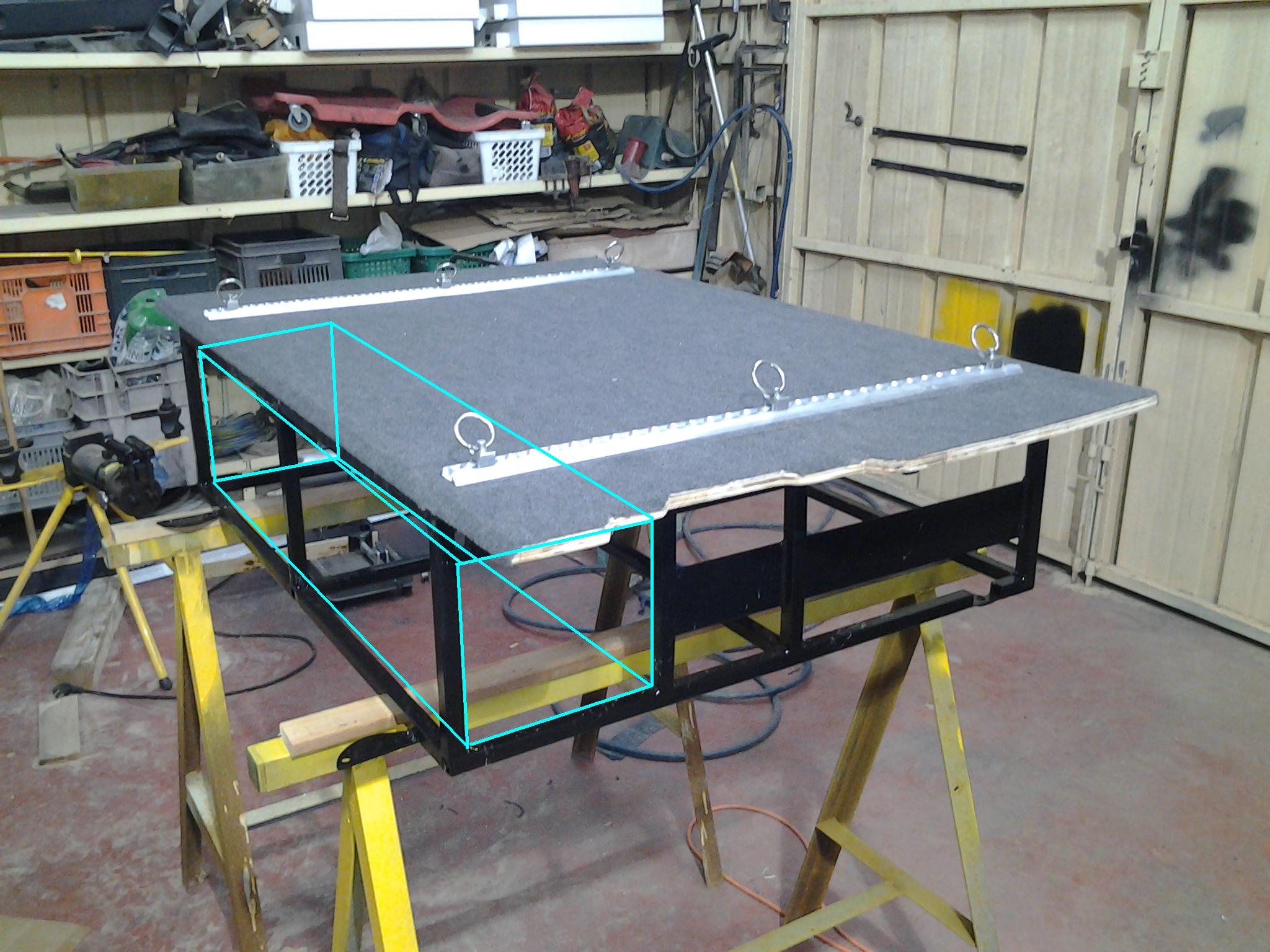 בבניה של המסגרת, היו כמה דברים שצריך לקחת בחשבון, עיגון היחידה לרצפת הטרופר,  צריך להכין מקום לקבע את המסילות, מה עוד שאת הרצפה המדומה, חתכתי דיקט 17 מ"מ, הוא מקובע באופן קבוע למסגרת, במידה וארצה להוציא את היחידה מהטרופר, אצטרך להוריד קודם את הדיקט, כי אין מצב שיצא ככה.