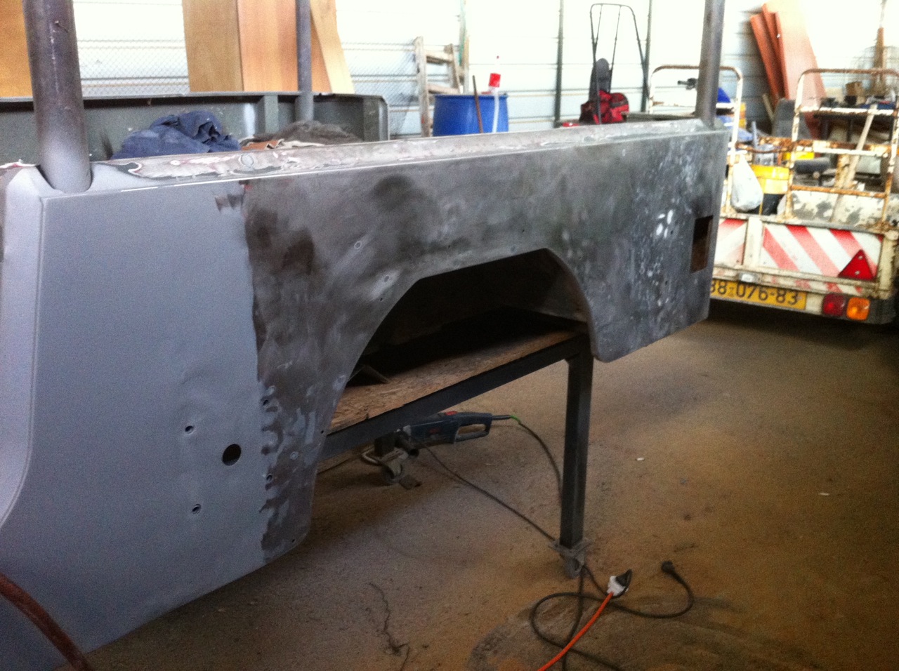 בעזרת דיסק גירוד "9 ודיסק מברשת כוס "4.5 הורדתי את הצבע והחומר הישנים עד היסוד/ברזל, איפה ומה שאפשר תיקנתי פחחות עם פטישים וסדנים.
