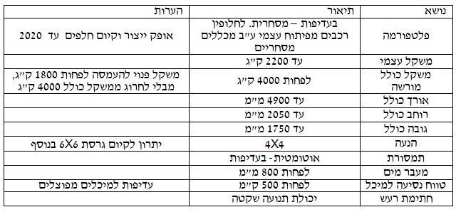 הרכב נדרש לאפשר ניוד נהג+ 2 נוסעים בשורה קדמית ובנוסף לאפשר ניוד נוסעים נוספים/ מגוון סוגי ציוד על בסיס דיגום משטחים ייעודיים בתנאי שטח קשים ומגוונים (בוץ , חול , מכשולי סלע וכו').
