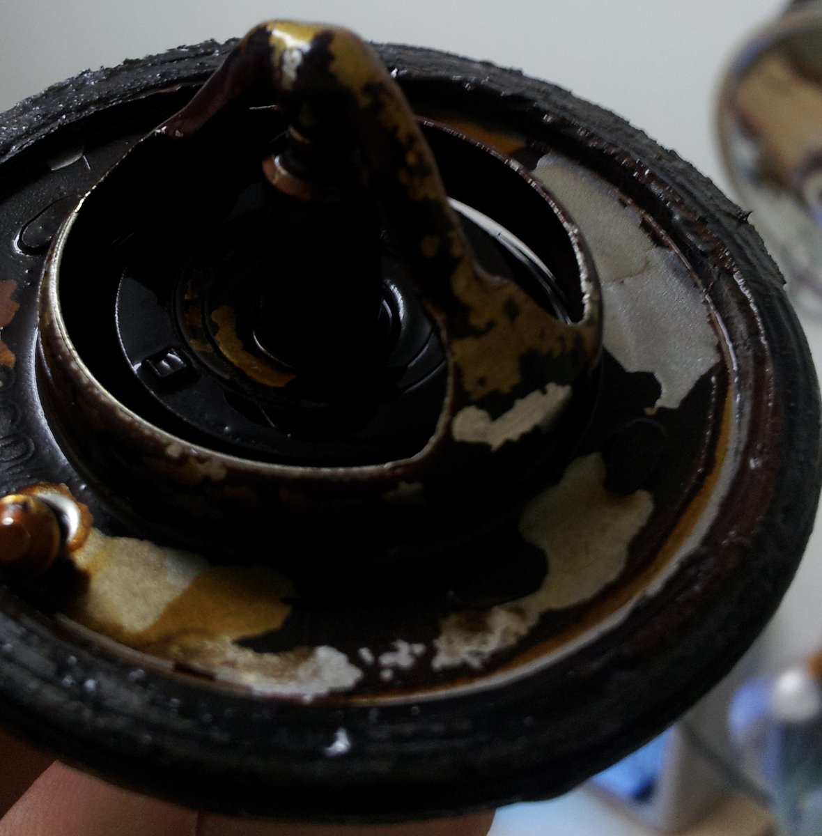 את הטרמוסטט הישן לקחתי הביתה. אני מצרף תמונות שלו במצב קר ובמים רותחים. רואים שבמצב קר הוא פתוח קצת ואני מקווה שזו הסיבה לתופעה ולא בעייה במד/חיישן וכו