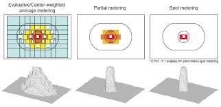 - מדידת אור חכמה - Evaluative / Matrix: במצב זה חיישן האור מחלק את התמונה למספר רב של אזורים. כל אזור מקבל משקל שונה ולבסוף כל הנתונים מוזנים למשוואה המחשבת את הממוצע הנאמן ביותר למקור.