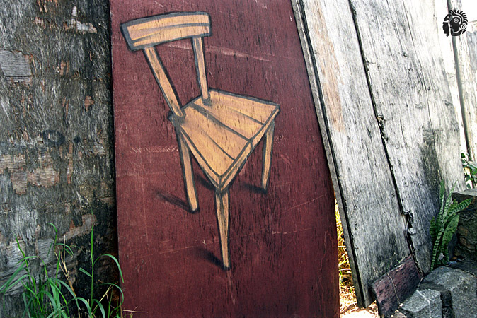 התמונה משמאל מראה ציור של כסא על גדר עץ -