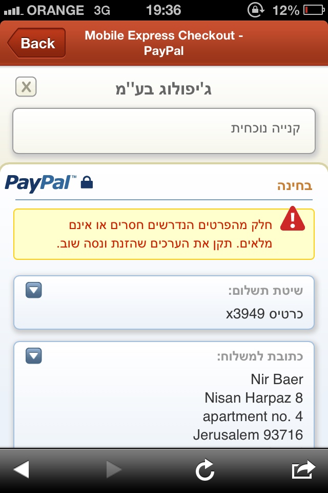 הזמנתי, רק במעבר מפייפאל חזרה לחנות אירעה שגיאה.