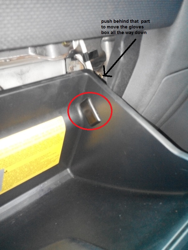 פותחים את תא הכפפות התחתון, עלינו להכניס בזהירות את הפלסטיק/גומי שנמצא מאחורי החלק שמוקף בעיגול כך שיעבור את קו לוח השעונים (יש שם גליל גומי קטן שניתן ללחוץ ולחוש אותו באצבעות), אמורים להיות 2 כאלו, אחד בכל צד של התא, אצלי יש רק אחד.