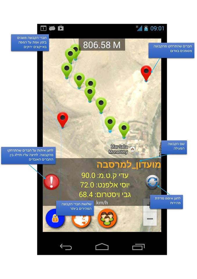 * מאפשרת רכיבה בקבוצות של עד 50 איש - כולם על המפה בזמן אמת - מי שהתרחק מהקבוצה מוצג באדום