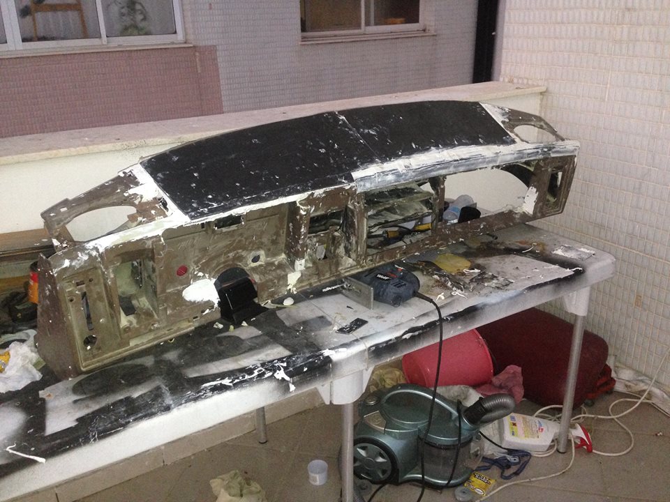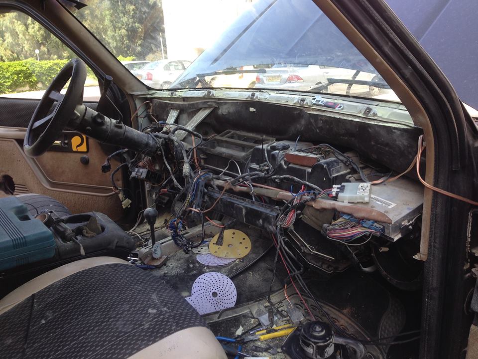 דשבורד בכלים כאלו מפרקים כולל הכל. פתיחת הברגים בצדדים, הברגים של ה״רגל״ שהיא הקונסולה שמחברת את החלק המרכזי לריצפה, פירוק תמך הגה וצינורות מיזוג חימום, פתיחת צמת חשמל והכל יוצא החוצה כיחידה אחת. אחכ על השולחן עושים פירוק משני שיש בו עשרות ברגים וחיבורי פלסטיק