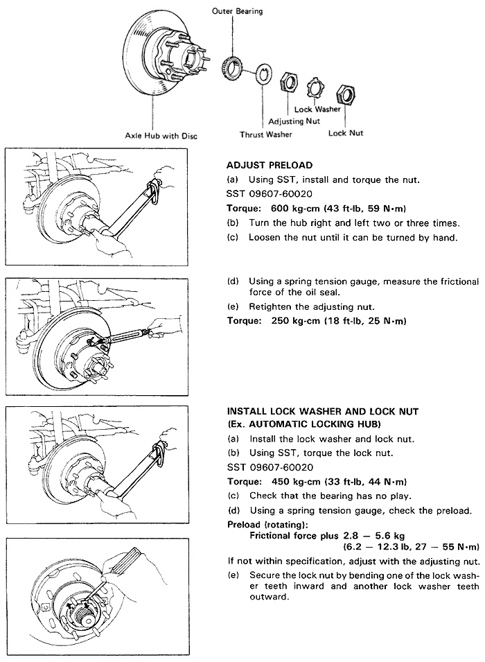 2. Under the truck on 2WD models, there is an equalizer bar where the 2 cables come together. Tighten or loosen the adjusting nut until the lever travel is within the proper range. Check that the rear brakes are not dragging.
