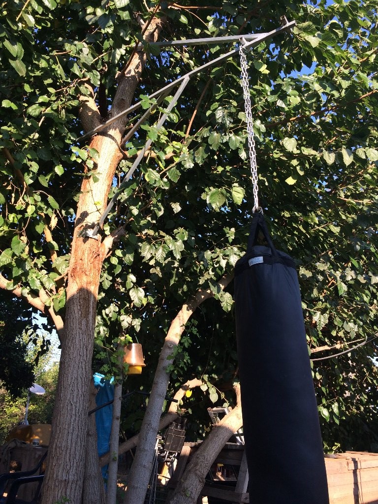 מתחתי פשוט חבל לכיוון של עמוד אחר מכיוון העץ ותליתי את השק איגרוף באמצע מהחבל...