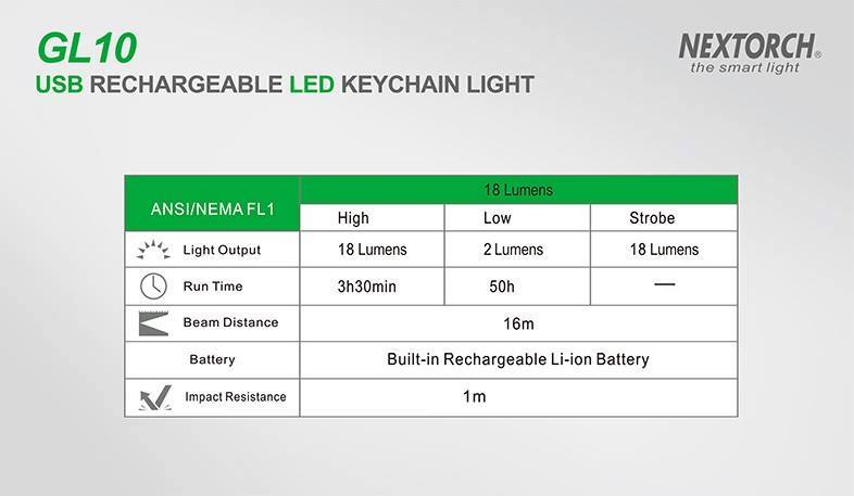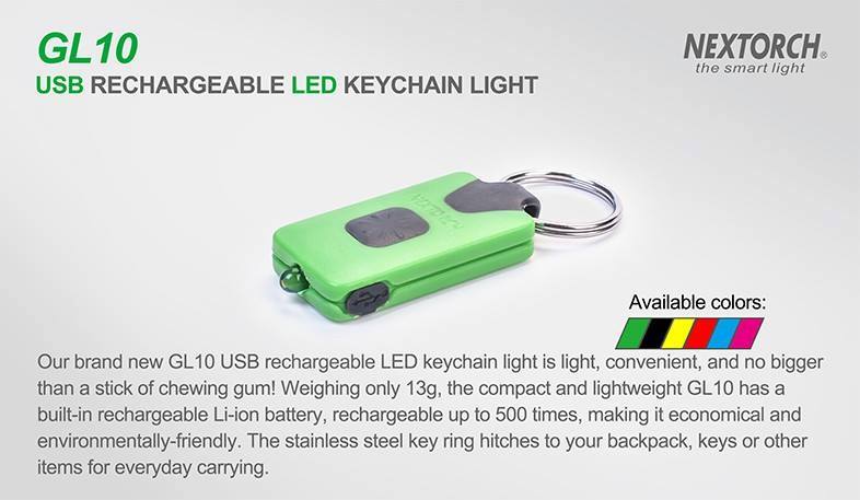 פנס הGL-10 הוא פנס LED הנטען על ידי חיבור USB. משקל הפנס הינו 13 גרם בלבד, מה שהופך אותו לפנס אידיאלי לנשיאה על מחזיק המפתחות.