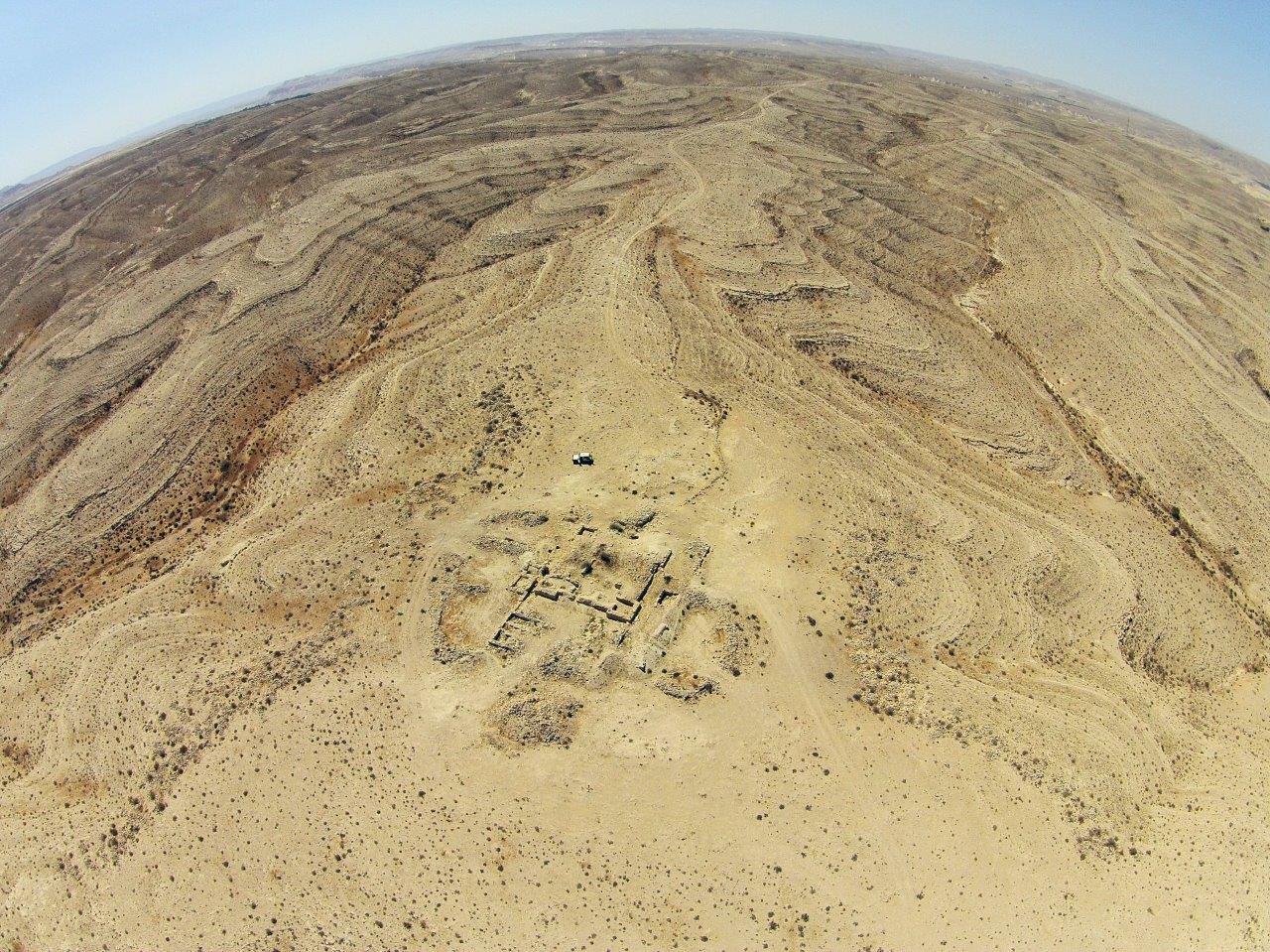הנה הפרס, בו ניתן לראות יפה במרכז התמונה מימין לשיא הגובה של השלוחה את סוללת איסוף המים למצד, האוספת למעשה את כל המים ממפנה השלוחה הדרומי אל תוך הח'ראבה.