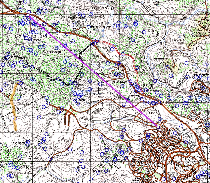 אני רוצה להגיע מהכניסה של מצפה מודיעין בכביש 443 דרך השטח, בשבילים כבושים, עד לאיזור היציאה של מערת הנזירים בכביש הגישה של מודיעין, בואכה רחוב עמק האלה. או לכל הפחות משהו סמוך מאד לו.